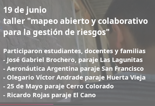 En el marco del acto de día de la bandera se realiza el Taller de mapeo abierto y colaborativo para la gestión de riesgos en el SUM municipal de Río de los Sauces Se dio en Río de los Sauces un taller sobre “Mapeo abierto y colaborativo para la gestión de riesgos” a las escuelas rurales de Las Lagunitas y parajes cercanos. Se encuadró en el proyecto de extensión “Programa para contingencias ante desastres naturales y mitigar los efectos del cambio climático” dirigido por el profesor José Raviolo y codirigido por el técnico Daniel Bellomo. Participaron estudiantes, docentes y familiares de las siguientes escuelas primarias: José Gabriel Brochero, paraje Las Lagunitas; Aeronáutica Argentina, paraje San Francisco; Olegario Víctor Andrade, paraje Huerta Vieja; 25 de Mayo, paraje Cerro Colorado y Ricardo Rojas paraje El Cano. Esta actividad se articuló con el programa “Mapeo abierto para todos” del Equipo Humanitario de OpenStreetMap Hub Latinoamárica y Caribe, y contó con la participación del coordinador, Tim DeWinter. La UNRC tiene el campo Las Guindas en Las Lagunitas. En tal sentido, se realizan acciones en pos de desarrollar un plan de contingencia ante posibles desastres naturales, especialmente violentos en un contexto de cambio climático, para mitigar sus efectos y estar preparados para actuar en consecuencia. El proyecto permitirá facilitar a las comunidades el acceso a tecnologías de software libre de mapeo humanitario, que hacen un uso eficiente de los recursos para proteger a las personas, sus bienes, los bienes comunes y el ambiente natural.Se brindó un taller de mapeo para afrontar desastres naturales.