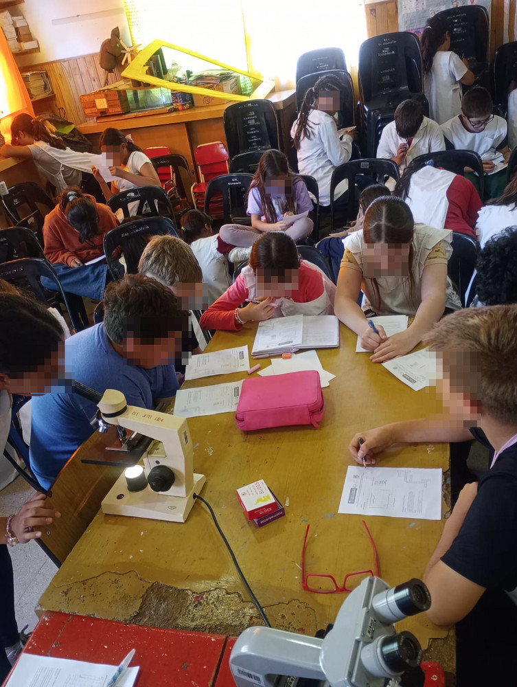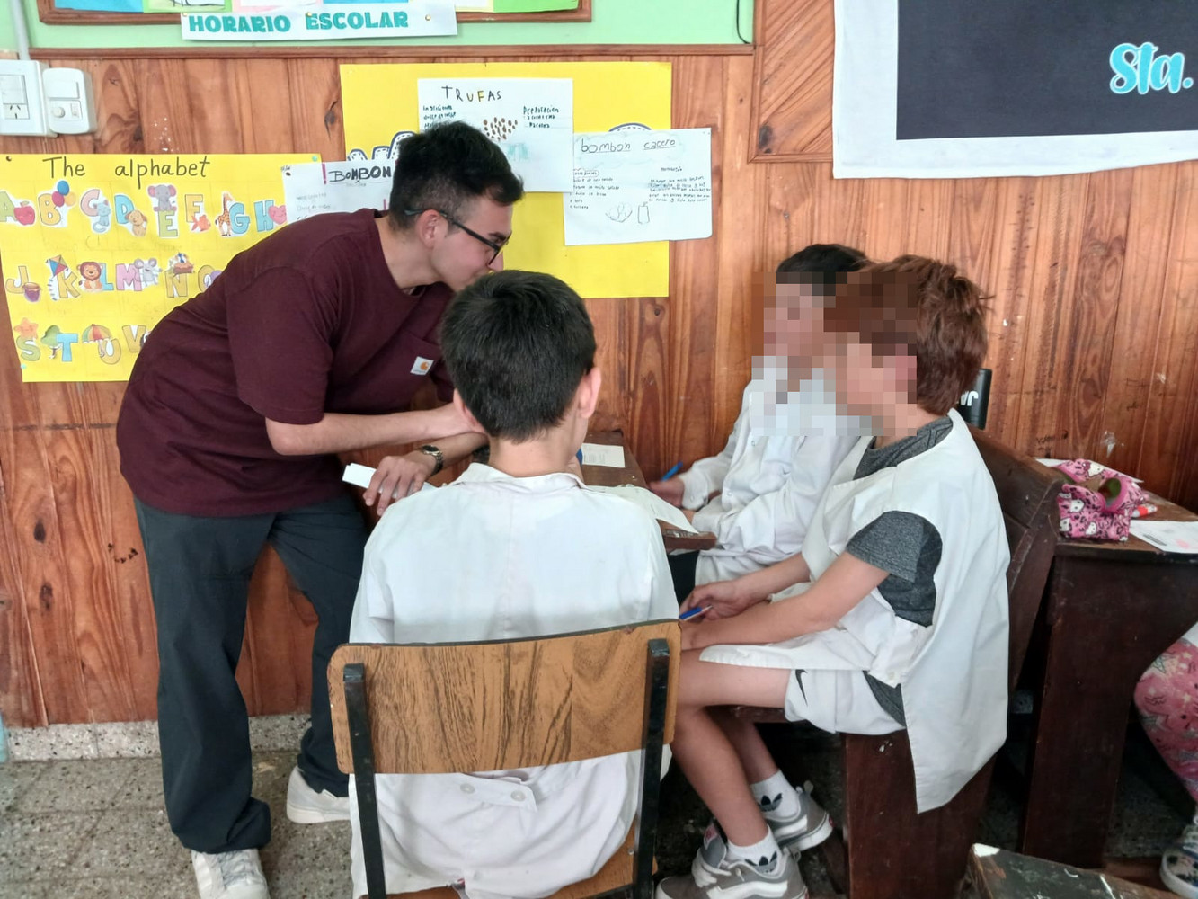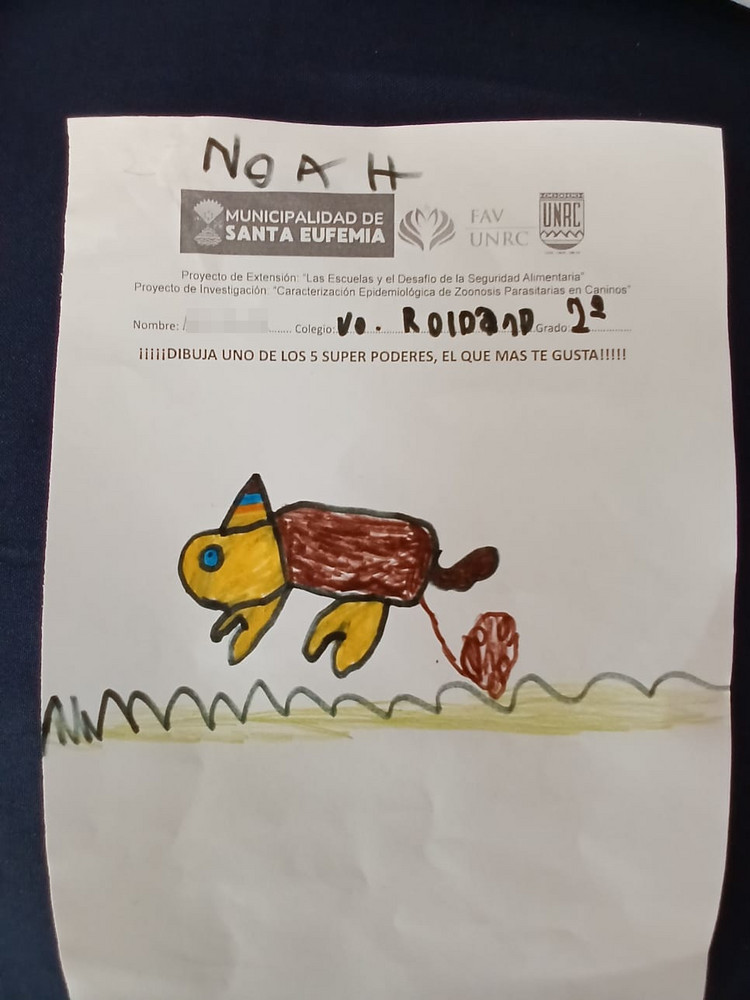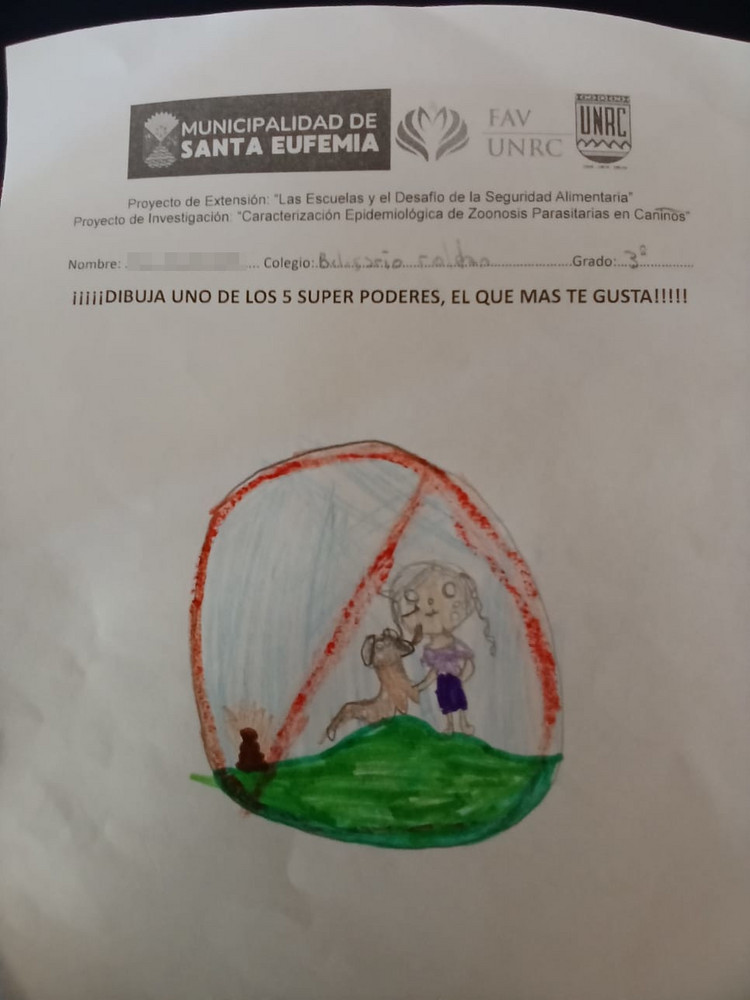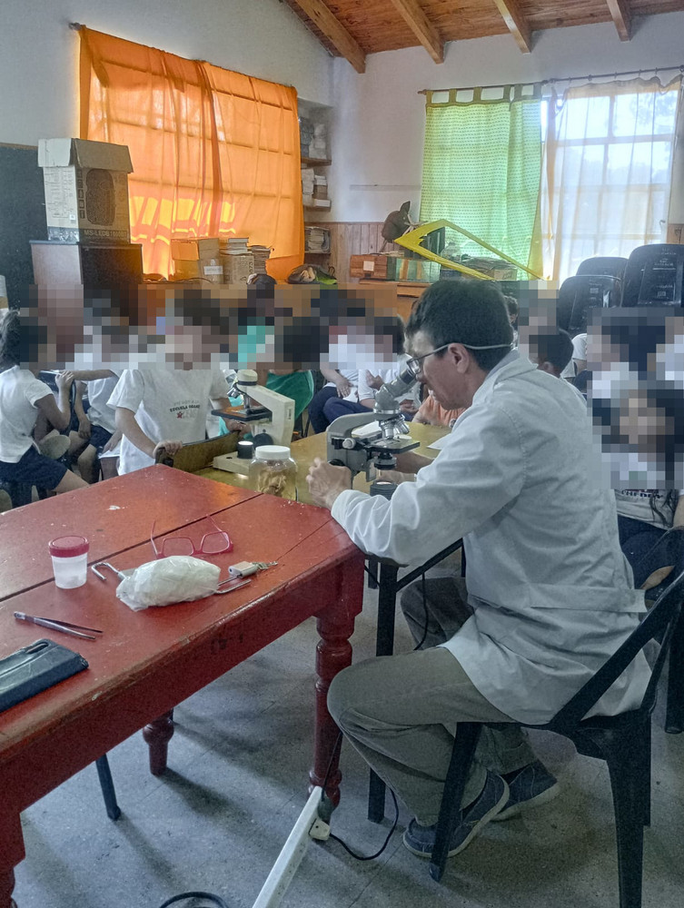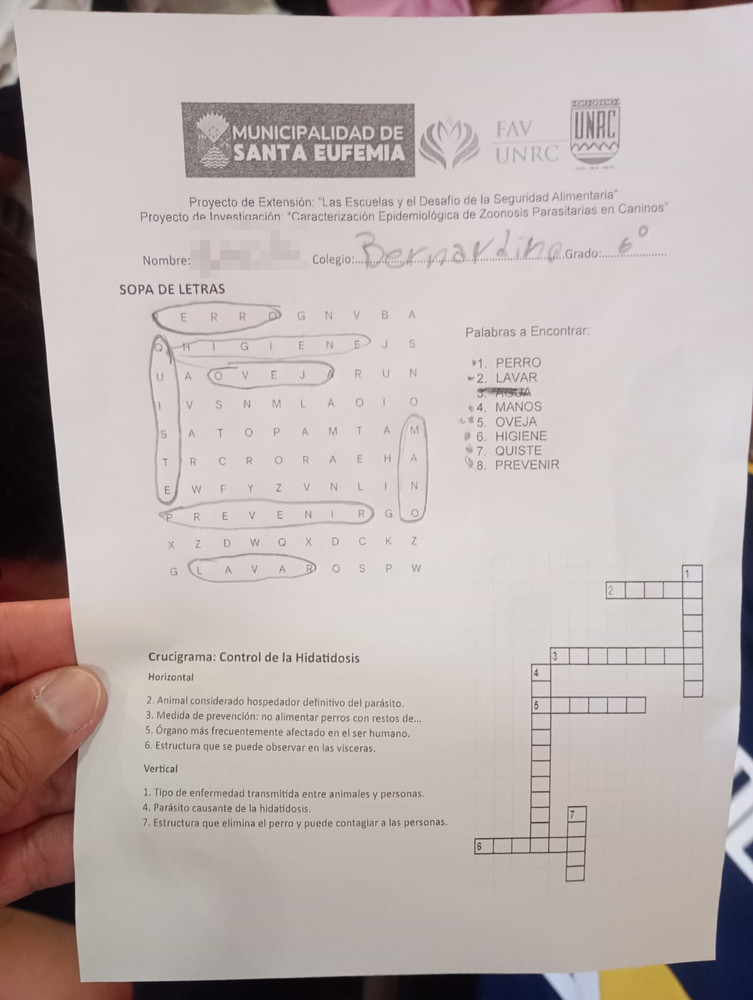 En el marco de los proyectos de investigación 'Caracterización Epidemiológica de Zoonosis Parasitarias en Caninos' y de extensión 'Las Escuelas y el Desafío de la Seguridad Alimentaria', docentes de los Departamentos de Patología Animal y Salud Pública brindaron charlas educativas en escuelas primarias y secundarias de la localidad de Santa Eufemia (Córdoba) El jueves 16 de octubre, en el marco de los proyectos de investigación “Caracterización Epidemiológica de Zoonosis Parasitarias en Caninos” y de extensión “Las Escuelas y el Desafío de la Seguridad Alimentaria”, docentes de los Departamentos de Patología Animal y Salud Pública brindaron charlas educativas en escuelas primarias y secundarias de la localidad de Santa Eufemia. El objetivo de estas charlas fue difundir medidas de prevención frente a las zoonosis parasitarias en caninos, particularmente aquellas vinculadas a la elaboración y consumo de alimentos en zonas rurales de la provincia de Córdoba. Esta iniciativa surgió a partir de una necesidad planteada por la intendenta de la localidad, Gisella Barrionuevo, quien, tras conocerse un caso de hidatidosis en las inmediaciones de la ciudad, advirtió la urgencia de implementar acciones que protejan la salud de la comunidad. La actividad agropecuaria representa un factor de riesgo reconocido para diversas enfermedades zoonóticas, como brucelosis, tuberculosis, hidatidosis y leptospirosis. El principal riesgo de transmisión se relaciona con el contacto directo con animales o con sus excreciones, secreciones, productos y subproductos. En el caso específico de la hidatidosis, uno de los factores socioculturales que favorecen su propagación es la cría de animales, especialmente ganado bovino, caprino y ovino. En estos contextos es común la práctica de faena domiciliaria, una tradición ancestral que se realiza tanto para el consumo familiar de carne como para su comercialización o intercambio local. Esta faena, al realizarse sin controles sanitarios, facilita la entrega de vísceras crudas a los perros, lo que perpetúa el ciclo biológico del parásito causante de la enfermedad.Fotos